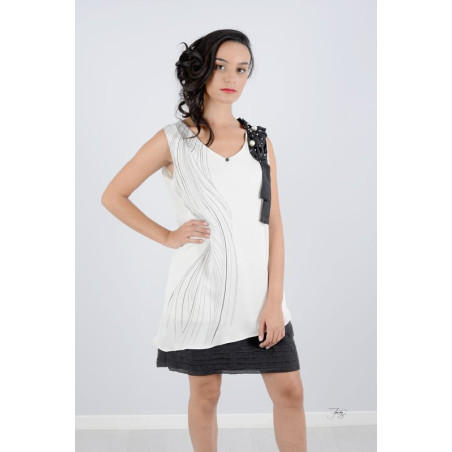Asymétrique, la doublure noire apparaît sur le bas de la robe, décoration fleur noir et perle blanches sur l'épaule gauche.